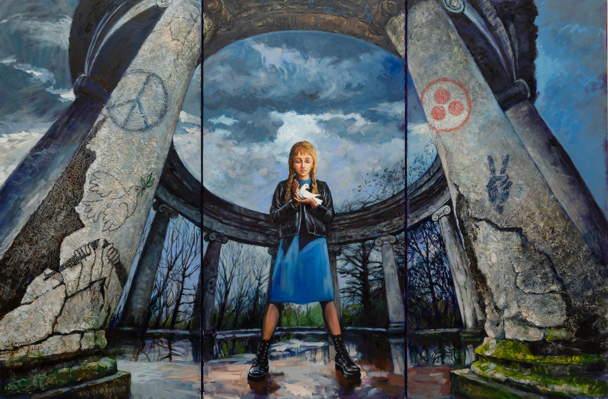 «Signs» is a painting about choice. Every symbol here is a reminder: peace is not a given, but an effort. Peace must be cherished as carefully as this girl holds the dove.