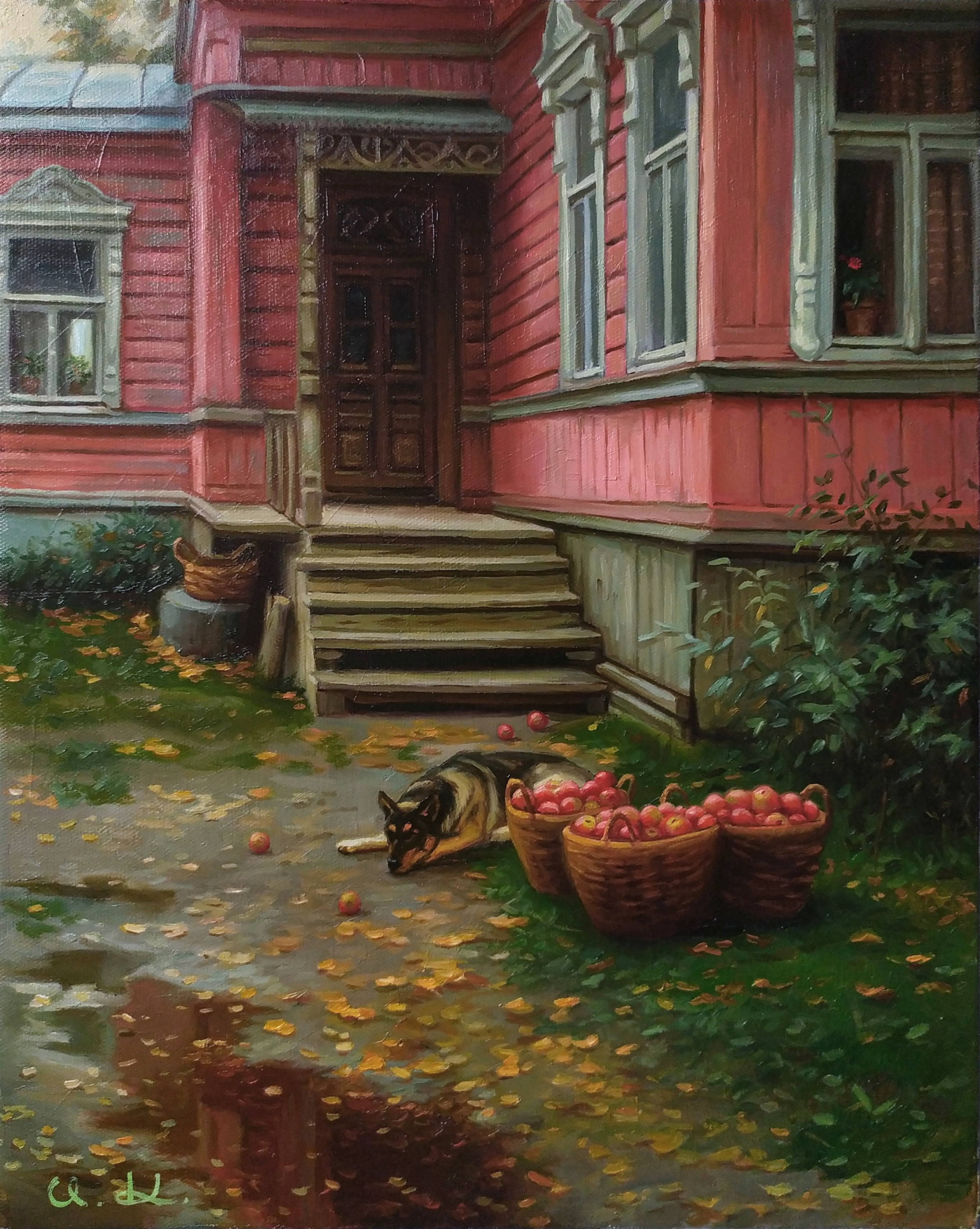 An original painting created using a multilayer painting technique based on materials from a trip through the villages of Russia.