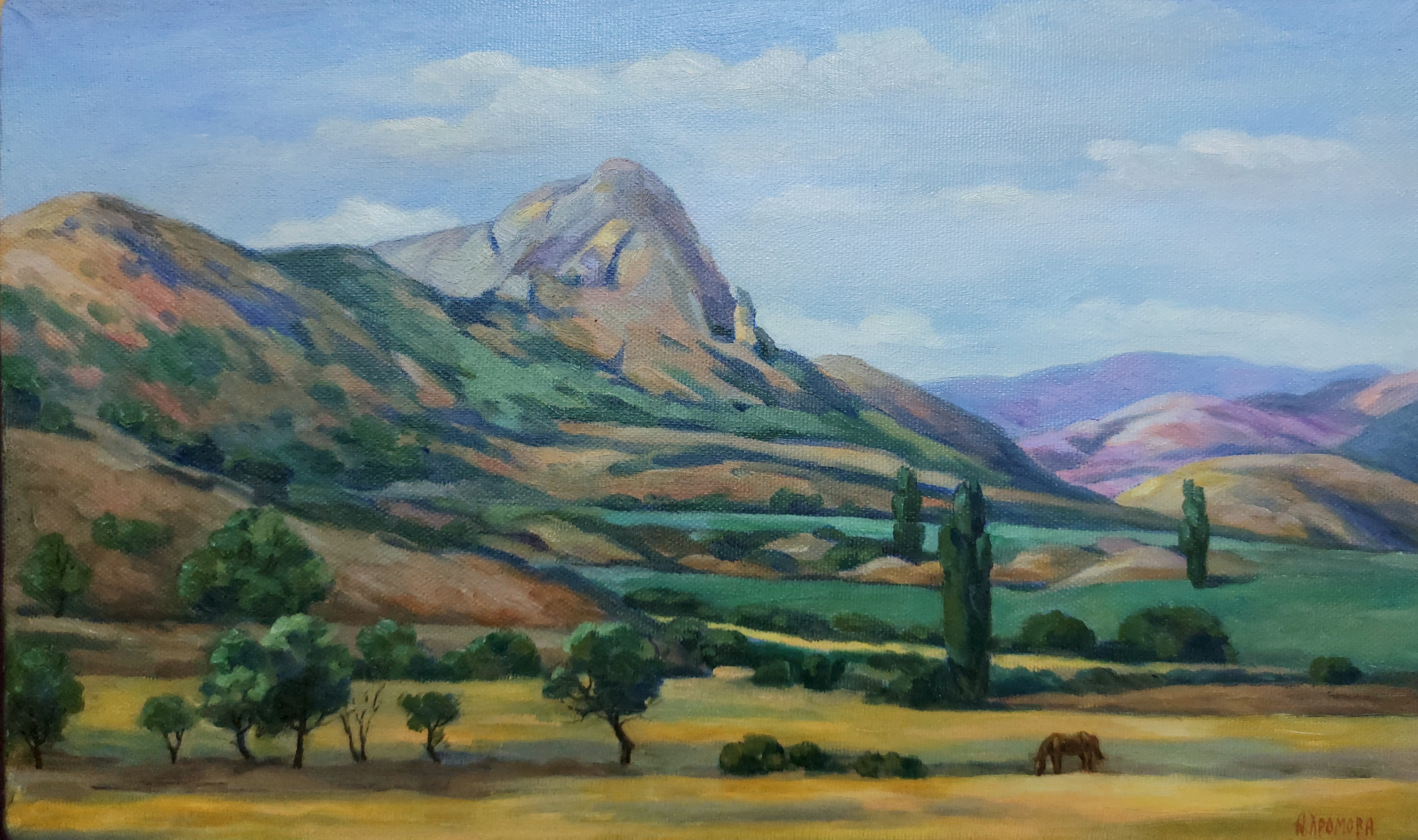 Anastasiya Khromova’s painting «Crimean landscape» is a warm and picturesque canvas celebrating the rugged yet beautiful nature of the Crimean mountains. The artist conveys the atmosphere of a sunny day, combining the power of rocky peaks with the softness of blooming valleys.