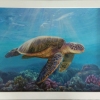 The central focus of the canvas is a sea turtle, gracefully swimming through the water. Its shell, painted in brown, green, and golden tones, appears ancient and wise. The turtle’s flippers, like wings, move smoothly, giving it a sense of grace and freedom. The artist captures the texture of the shell with remarkable precision, creating a feeling of its hardness and, at the same time, vitality.