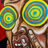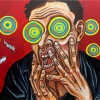 Roman Defoe’s painting “SELFPORTRAIT WITH CIRCLES” (Self-portrait with Circles) is a powerful and visually rich piece that explores the theme of distorted perception, mental noise, and the difficulty of grasping the true picture of the world. The artist uses an expressive style and bright, contrasting colors to convey a state of inner turmoil and information overload.