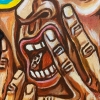 At the center of the composition is the artist’s self-portrait, rendered with strong distortion of facial features. His eyes are replaced by bright concentric circles, reminiscent of hypnotic patterns or whirlpools. These circles, painted in yellow, blue, light blue, and orange tones, create a sense of dizziness and disorientation, as if the artist’s gaze is literally being absorbed by these patterns. The face is tense, the mouth wide open in a scream or moan, fingers digging into the face, trying to calm the inner chaos.