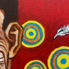 The red background on which the image is placed intensifies the emotional tension. It evokes feelings of anxiety, aggression, or, conversely, passion overwhelming the artist. Around the head, like echoes of this inner whirlwind, are scattered several smaller circles as well as a few feathers, which may symbolize fragility, lightness, or, on the contrary, distracting factors that lead away from the essence.