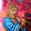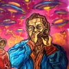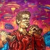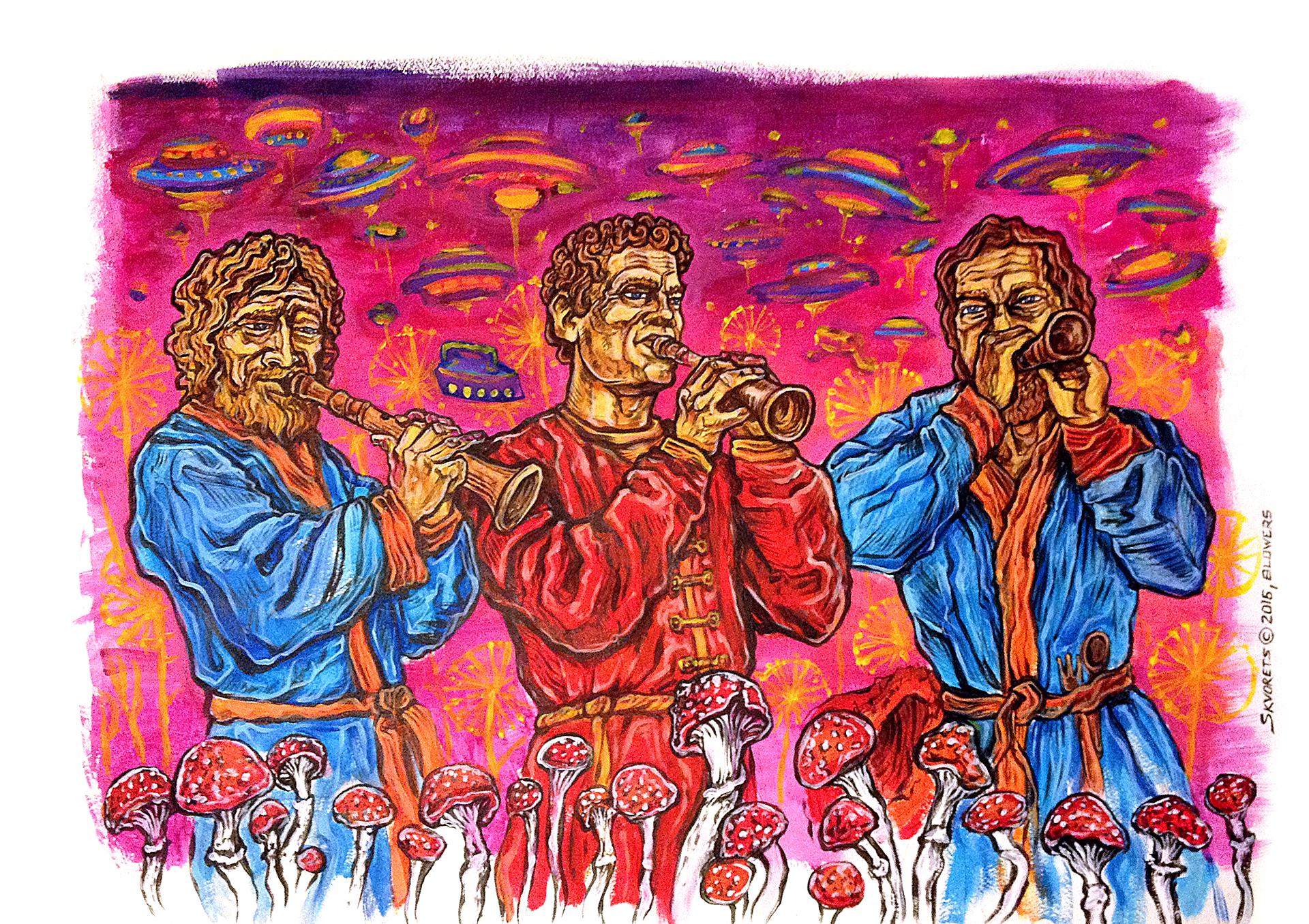 Local rural musicians, performing before their usual village audience but having eaten some mushrooms beforehand, suddenly realize that their concert has taken on the scale of an intergalactic show. This painting has been sold. However, it is possible to order a copy of it. Custom size: canvas 120x80 cm, paper 60x85 cm. Media: acrylic, canvas/paper