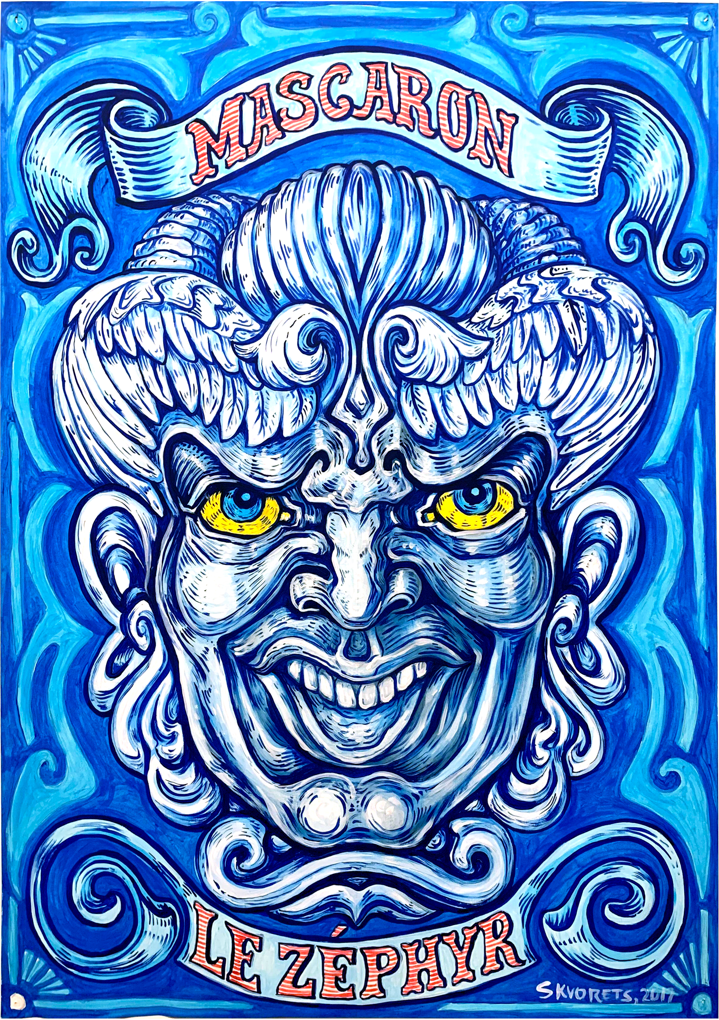 Later, I returned to this theme and created my own wine packaging project «Legend of the Mascarons», which, by the way, is presented on my second Behance profile dedicated to design and can be purchased for implementation by any winemaking company. Here is a poster made with acrylic on paper — Mascaron Le Zephyr.