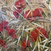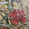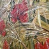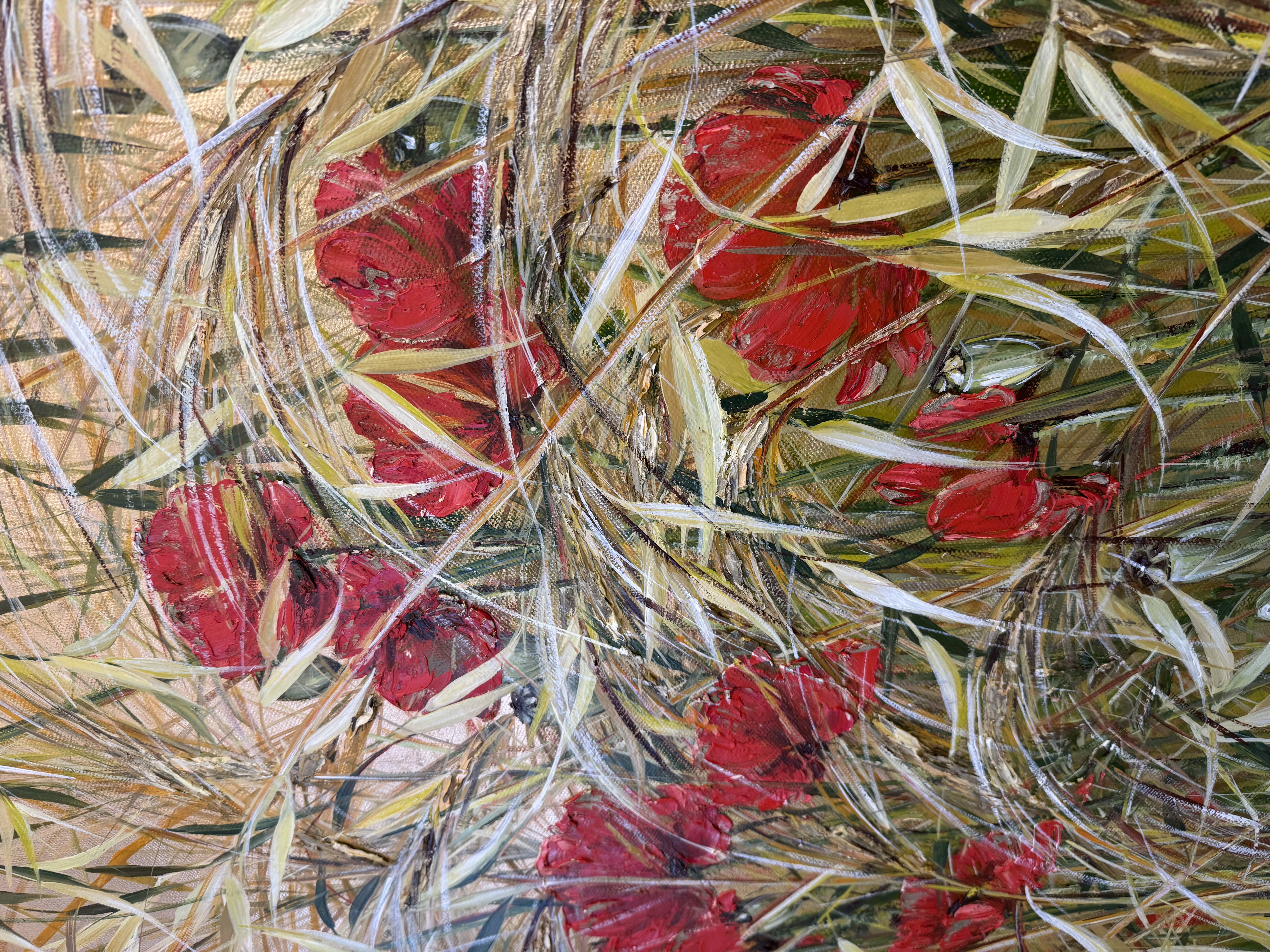 The dominant element is the fiery red poppies. Their color is applied with thick, juicy strokes that give the petals volume and sensuality. These scarlet spots strikingly contrast with the predominant background — tall dry stalks of cereals.