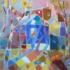 The trees depicted in the painting resemble lively fairy-tale creatures, their branches intertwining to form a whimsical pattern. On the ground is a mosaic of colored squares, reminiscent of a patchwork quilt. And in the lower right corner is a ginger cat, as if accidentally peeking into this vibrant world, adding liveliness and playfulness to the painting.