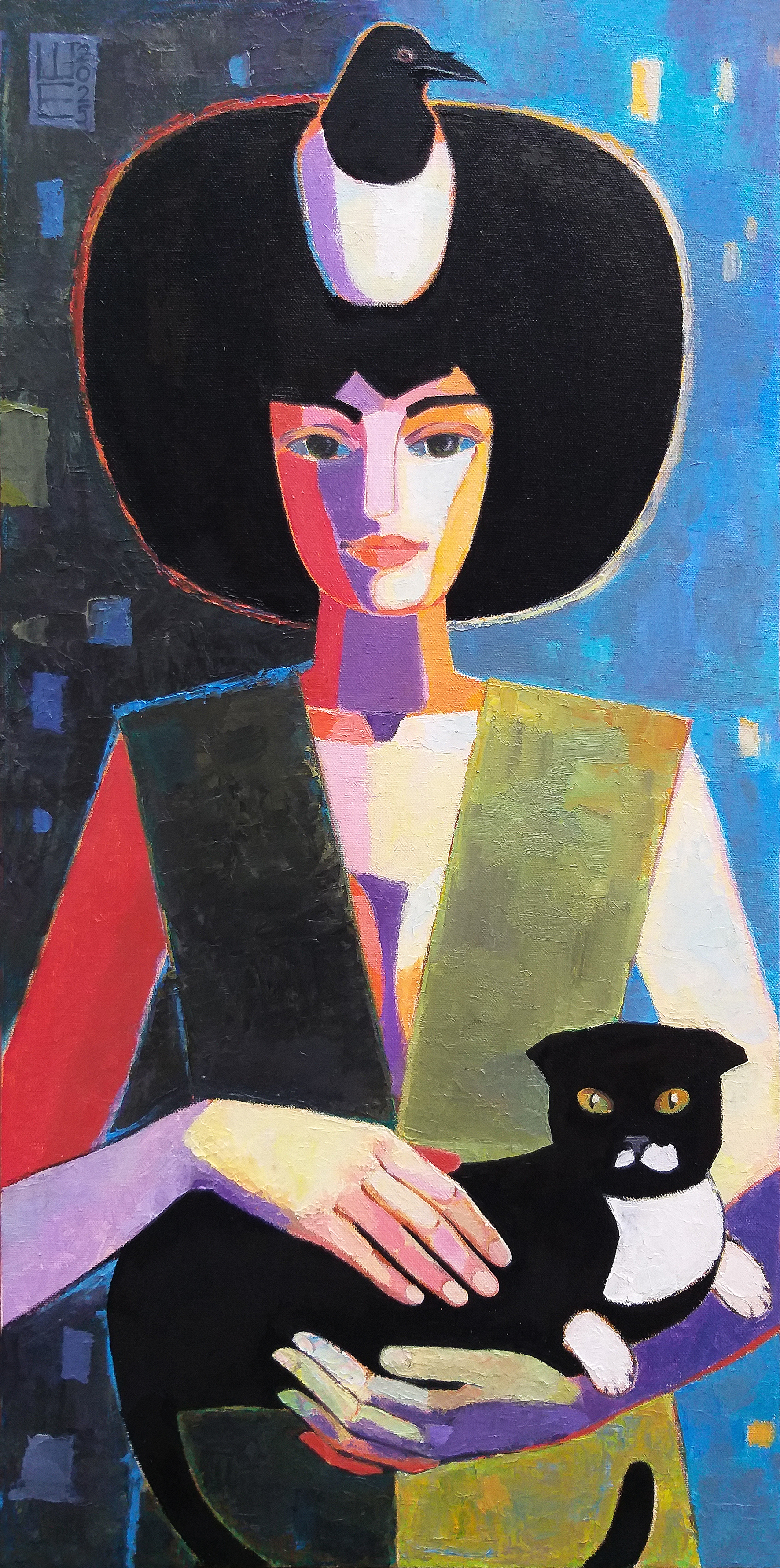 Elena Shipilova’s painting “My home is where the heart is” is a vivid, stylized portrait that explores themes of attachment, self-identity, and comfort through the lens of Cubism and expressive color. The artist creates a powerful image of a woman who has found her place in the world through a deep connection with a loved one.
