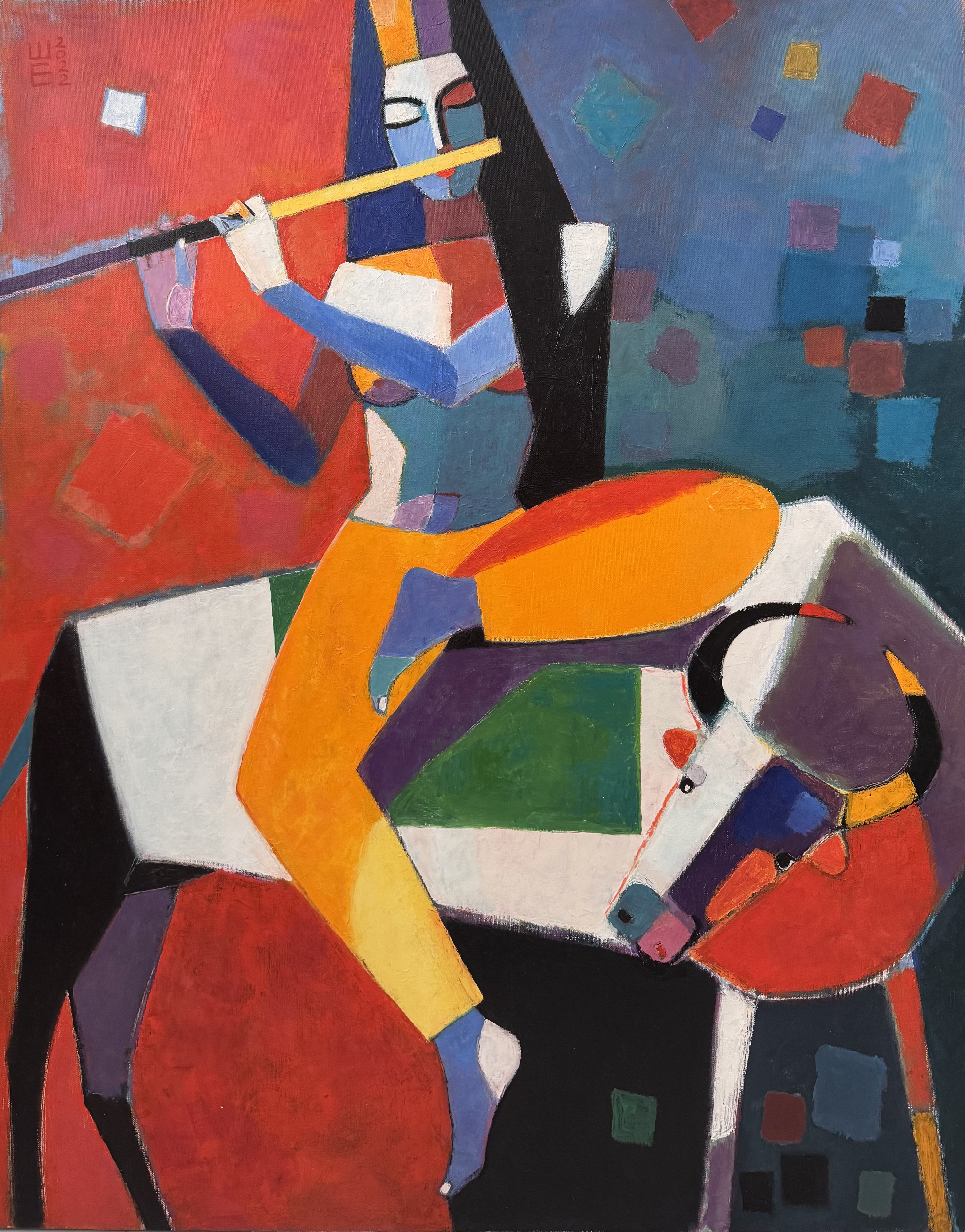 The animal on which the figure sits is also stylized and geometric. Its body is a combination of white, black, and red-violet planes with a barely defined head and horns.
