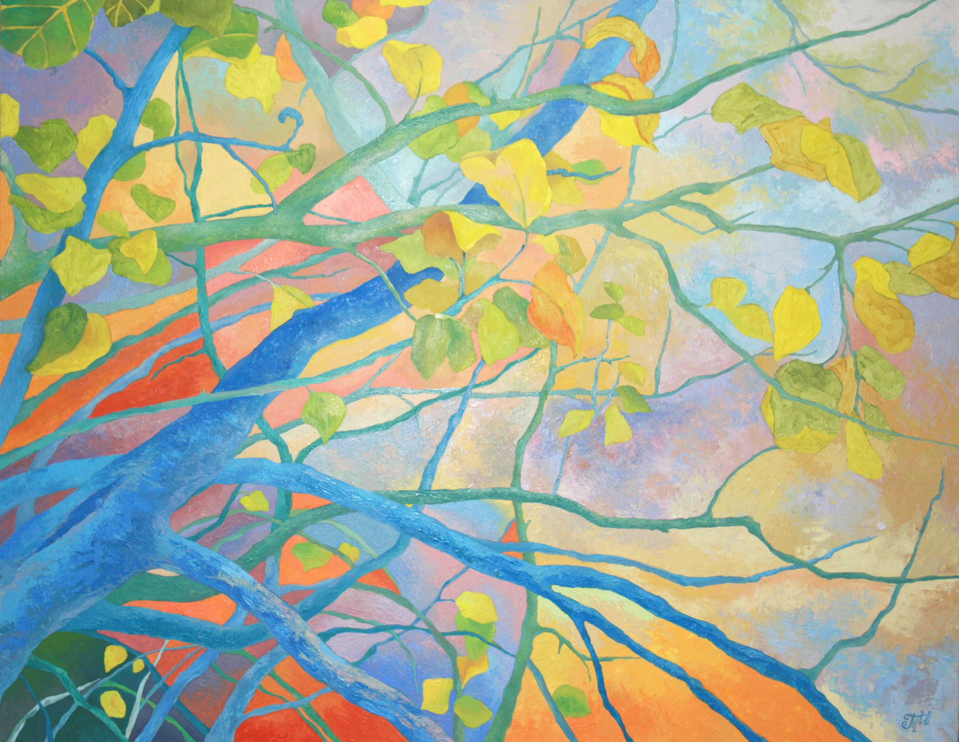 At the center of the composition are tree branches bending at whimsical angles. They carry the last leaves, painted in warm autumn tones: yellow, orange, reddish. These leaves, like the final glimmers of summer, still cling to the branches, ready to fall to the ground. Their bright colors contrast with the blue and light blue shades of the branches, creating a mesmerizing combination.