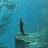 The place where the figure stands is the cliff’s edge, offering a view of the mysterious forest. The forest itself is painted in muted, deep blues and turquoise tones, creating a feeling of nighttime coolness and enigma. The trees, with their slender, graceful trunks like columns, stretch toward the sky, evoking a sense of verticality and aspiration upward. The branches, like hands, reach toward each other, forming natural arches and vaults.