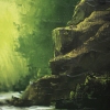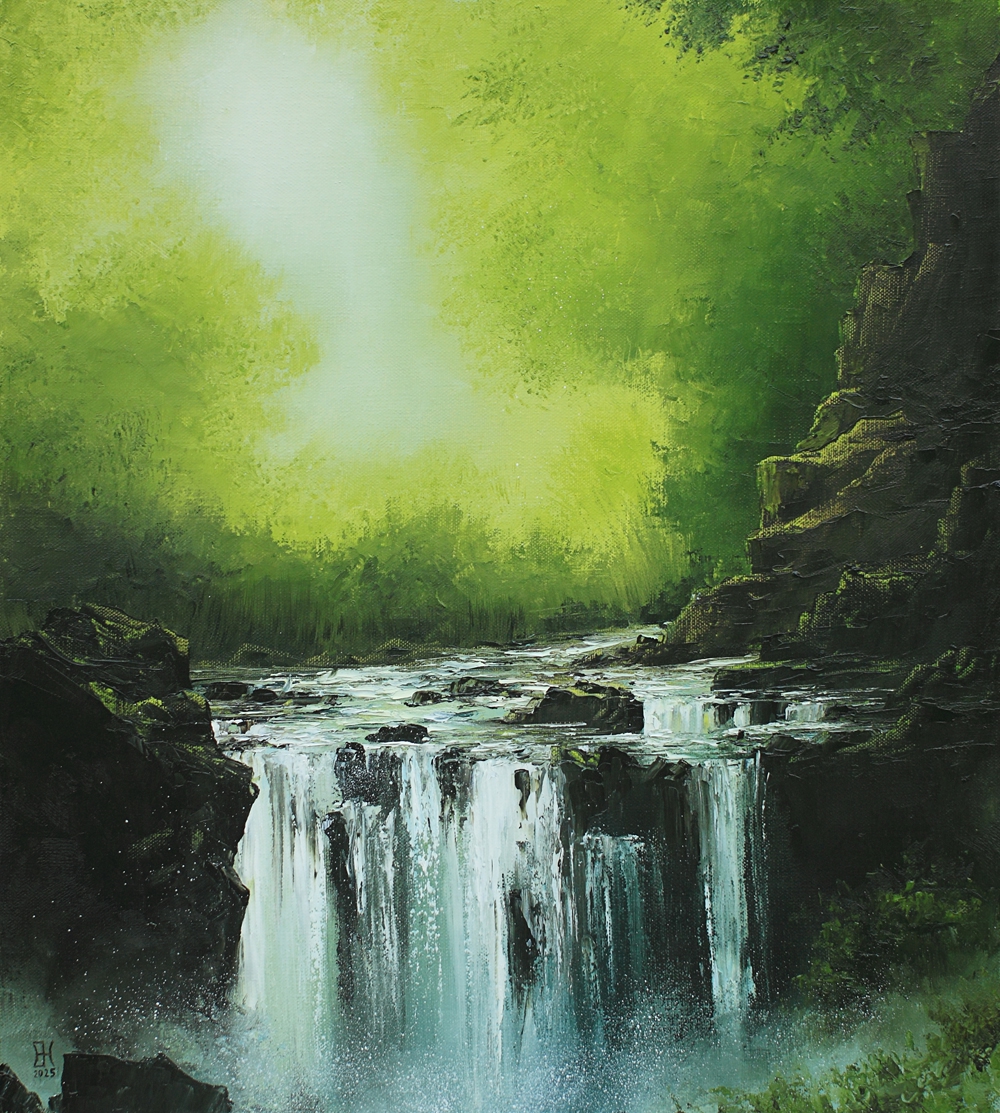 В центре композиции – мощный водопад. Вода, написанная с использованием белых и светло-голубых мазков, обрушивается с уступа, создавая ощущение силы, шума и постоянного движения. Энергия падающей воды передана настолько живо, что зритель почти слышит рокот потока.