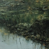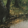 The central element of the composition is a pond, its surface covered with fallen leaves. These leaves, painted in golden, brown, and ochre tones, form a picturesque carpet reflected in the water. The reflections, like frozen pictures, give the water’s surface depth and realism.