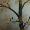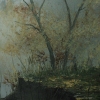 On the pond’s shore stand trees whose branches, stripped of dense summer foliage, emerge through a light mist. Their trunks, painted in dark, earthy tones, contrast with the golden shades of the leaves still clinging to some trees. These trees, like guardians of the autumn landscape, add depth and structure to the composition.
