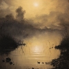 On the horizon, silhouettes of trees and possibly small hills can be seen. They dissolve into a golden haze, giving the painting depth and airiness. The absence of sharp contours and the soft color transitions create a feeling of fog or mist enveloping the landscape, making it more mysterious and dreamy.