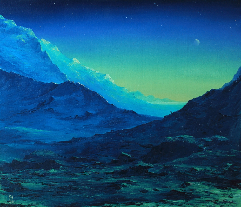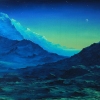 «Fenugreek» is a painting about the grandeur of wild, inaccessible nature. It is dedicated to the beauty of the mountain landscape illuminated by enigmatic celestial light and evokes a sense of awe before the power of the mountains.