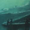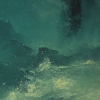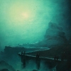 The entire scene is bathed in a dense misty glow rendered in rich turquoise and blue-green hues. This fog envelops the rock and water, softening the contours and creating the impression that the scene takes place in another dimension. Light breaking through the haze gives the painting an otherworldly, almost ghostly appearance.