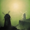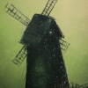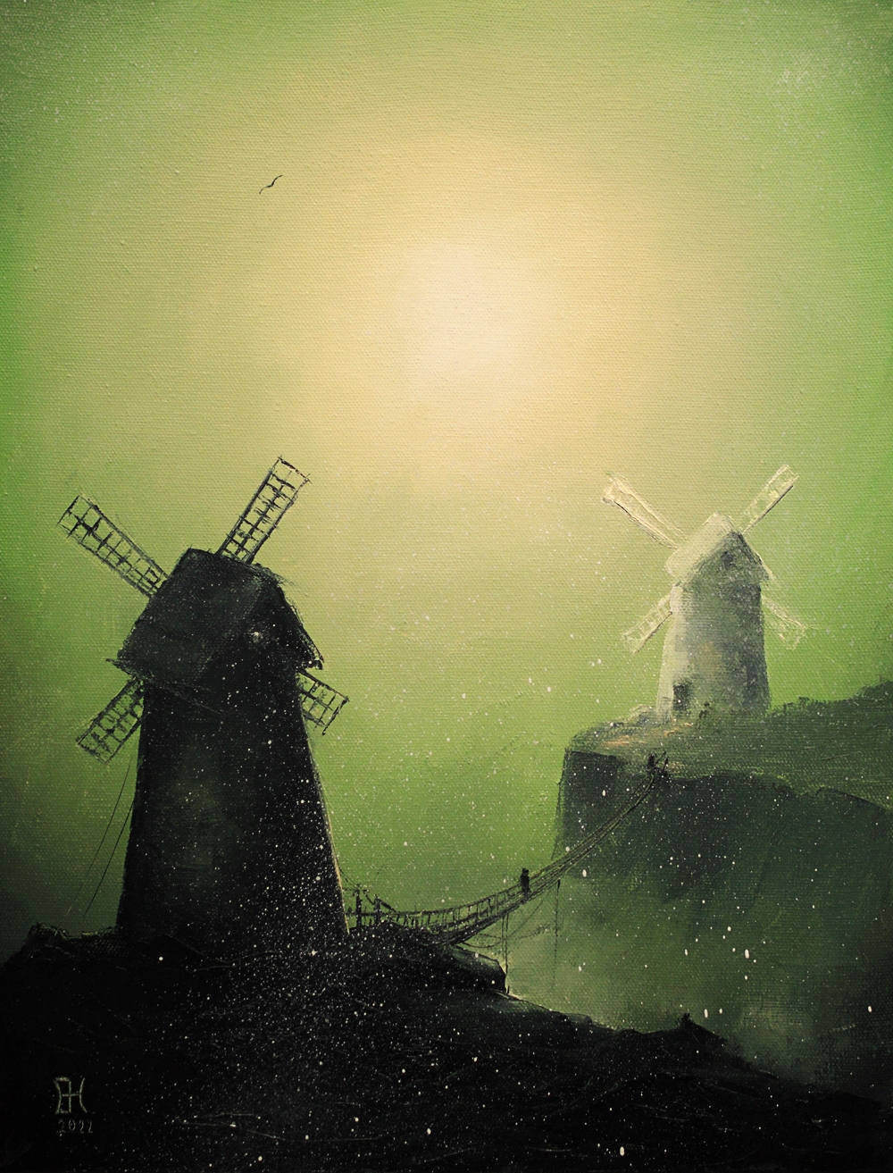 The canvas features two windmills, each embodying a certain path or state. One, dark and imposing, stands in the foreground, as if offering a proven but possibly dangerous path. The other, light and airy, rises on a distant hill, enticing with its promises. Between them is a fragile bridge, along which tiny human figures move, symbolizing ourselves at moments of making important decisions.