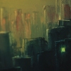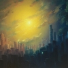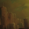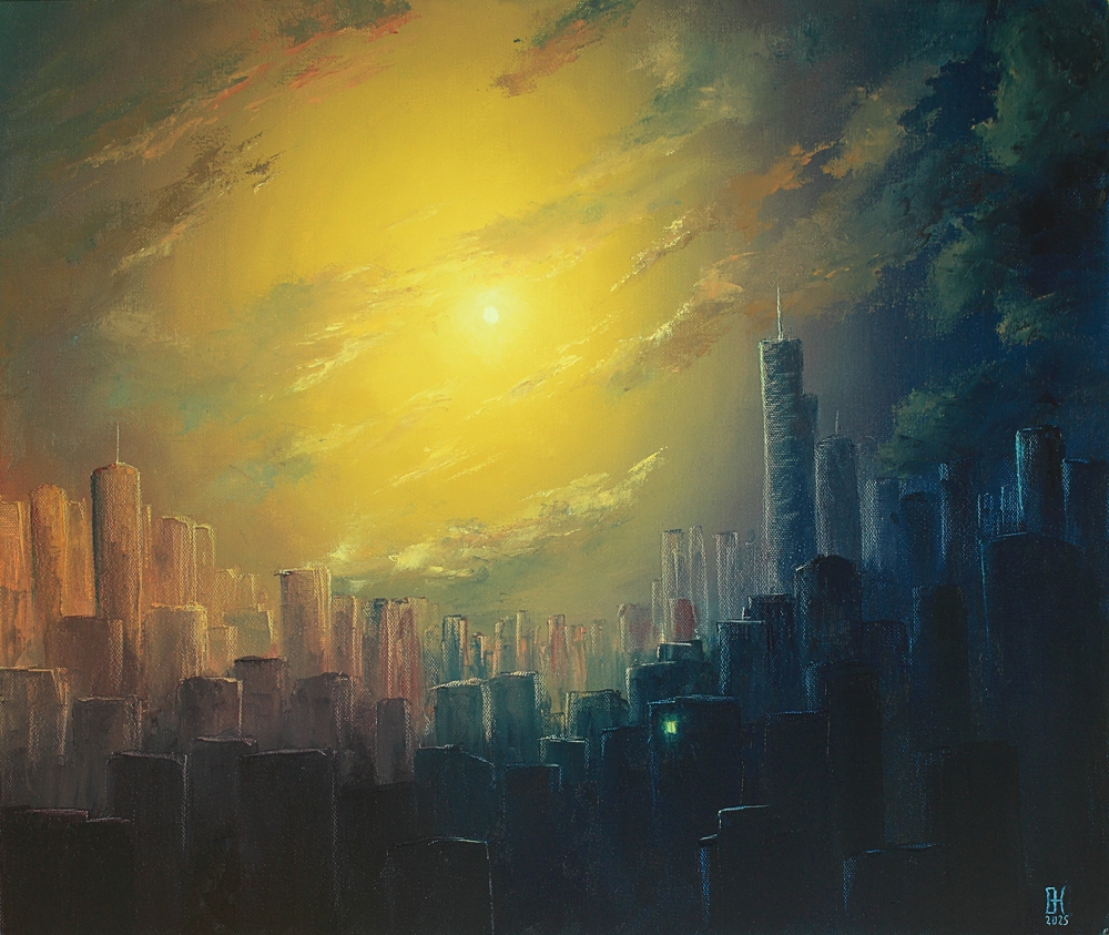 The sky on the canvas, painted in anxious golden and greenish tones, creates a sense of pre-storm or pre-dawn tension. The city silhouettes are immersed in deep shadow, turning into a monolithic mass devoid of detail. But it is precisely this darkness that makes the solitary green light in the window—«the only one»—especially piercing, testifying to the presence of a person, warmth, and someone’s personal story hidden from prying eyes.