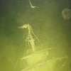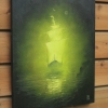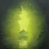The central object of the composition is a sailing ship, as if woven from light and dense emerald mist. It does not sail on the water but hovers above it like a ghostly vision, a wanderer from another world. The glow emanating from the ship cuts through the darkness, reflecting on the calm surface of the dark waters, creating an atmosphere of mystery and subtle unease. A tiny moon and a barely visible bird on the horizon only emphasize the ship’s endless solitude.