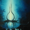 At the center of the composition is a glowing opening, intricately formed by the intertwining of tree trunks. This «portal» emits a soft, almost divine glow, reflected in the calm waters of a dark night pond. Surrounding it is a deep blue — the color of the cosmos, silence, and the unknown. Stars scattered across the canvas transform the forest into cosmic space, and the portal itself into a bridge between the earthly and the otherworldly.