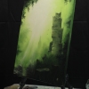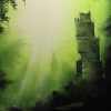The composition is built on contrast: massive stone ruins, whose outlines resemble the remains of towers, slowly dissolve into the emerald mist of the forest. Rays of light piercing through the damp haze create an atmosphere of sacredness, as if illuminating a monument to a civilization of which only legends remain. Klyuev masterfully uses shades of green — from deep, almost black shadows to light, otherworldly tones of light — conveying a sense of mystery and tranquility.