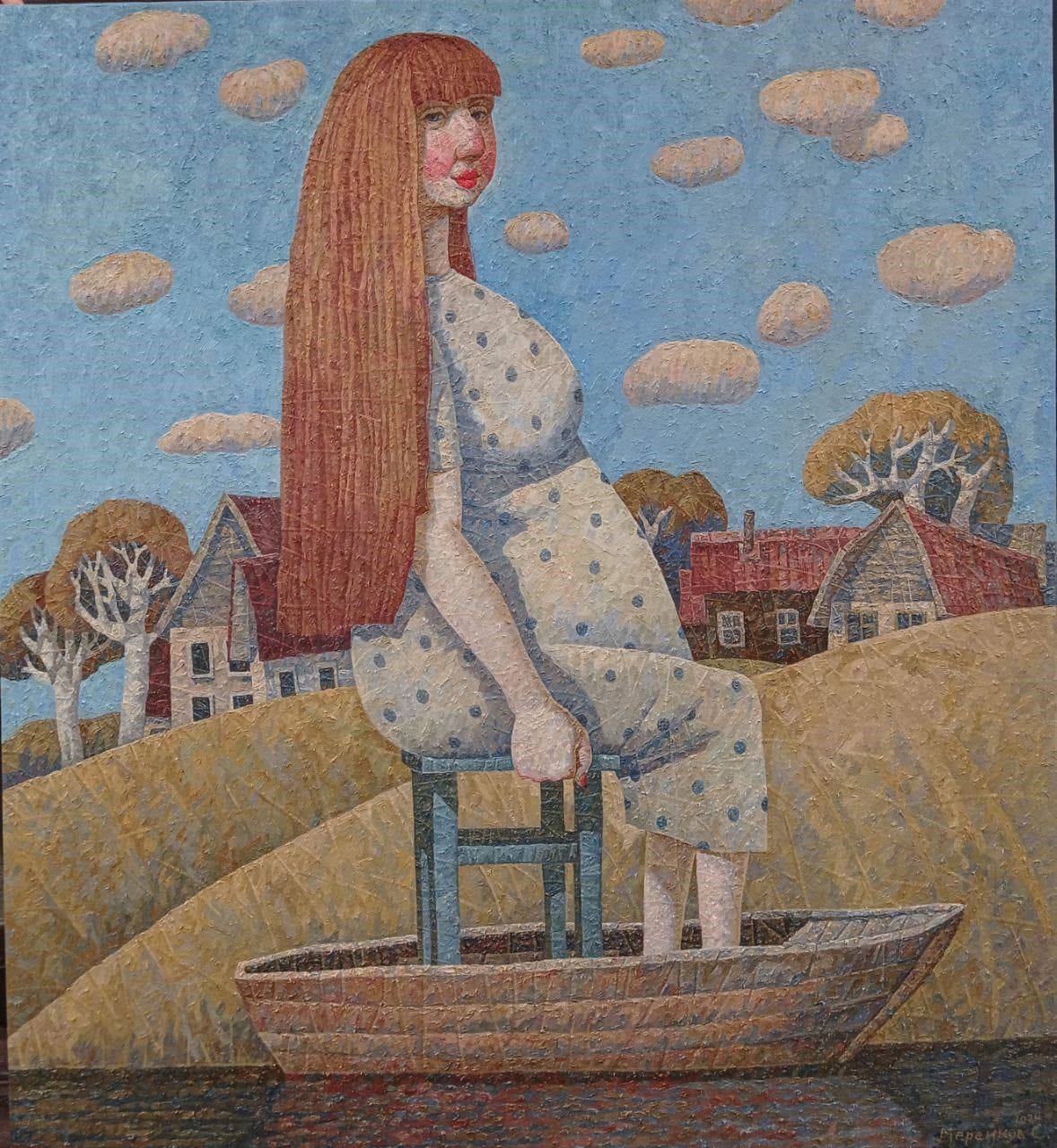 Sergey Merenkov’s painting “Cradle” is not just an image of a woman in a boat, but a multi-layered ironic reflection on motherhood, the path of life, the fragility and variability of being, and how we sail down the river of life, striving for our goals. The artist creates a grotesque and memorable image that simultaneously evokes a smile and makes one think about complex philosophical questions.