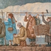 The canvas depicts a group of people riding in a kind of semblance of a bus. Their poses and faces express simultaneously fatigue, thoughtfulness, and perhaps some detachment. Each of them is immersed in his own thoughts and does not pay attention to others.