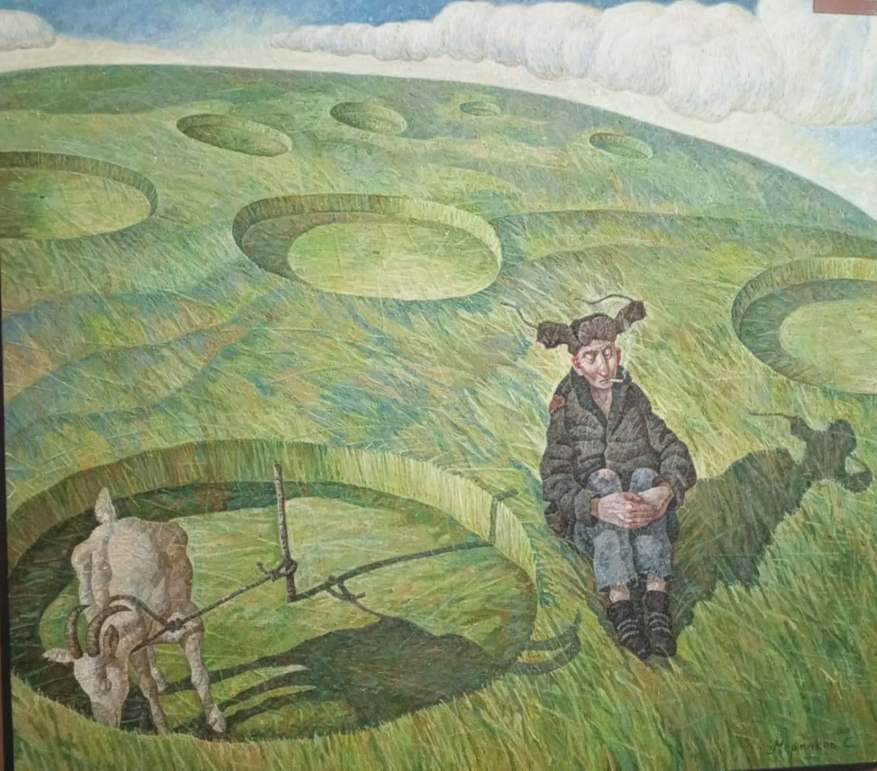 Sergey Merenkov’s painting “Crop Circles” is not just a landscape depicting mysterious circles in a field, but a multi-layered ironic reflection on the unknown, the mysteries of the universe, the human desire to understand, and how we interpret what goes beyond the boundaries of our understanding. The artist creates a grotesque and memorable image that simultaneously evokes a smile and makes one think about complex philosophical and esoteric questions.