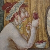 The canvas depicts a woman standing in front of a mirror. In one hand she holds a cherry, and in the other - a glass of wine. Her face expresses simultaneously concentration, self-admiration, and perhaps some self-irony. She seems to be trying to emphasize her attractiveness, despite her somewhat grotesque appearance.