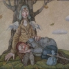 The canvas depicts two people sitting under a tree. One is sleeping with his head resting on the other’s lap, who has wings visible behind his back. Their faces express simultaneously fatigue, calmness, and perhaps some sadness. They seem to have traveled a long road together and share not only joys but also difficulties.