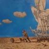 Sergey Merenkov’s painting “To the Water” is not just a landscape depicting a man pulling a ship across a desert, but a multi-layered ironic parable about dreams, aspirations, perseverance, and perhaps the absurdity of trying to achieve the impossible. The artist creates a grotesque and memorable image that simultaneously evokes a smile and makes us think about what drives us when we strive for our goal, and what it really means to “achieve” it. The canvas depicts a man laboriously pulling a ship across an endless desert. His face expresses determination, fatigue, and perhaps some obsession with his goal. He seems to ignore the absurdity of the situation and continues to move forward stubbornly, despite all the obstacles.