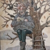 Sergey Merenkov’s painting “Birdhouse” is not just a depiction of a person in a tree, but a multilayered and mysterious composition, filled with symbolism and allowing for many interpretations. The artist creates an image of loneliness, solitude, and perhaps alienation, but at the same time endows it with shades of self-sufficiency and freedom. In the painting, we see the figure of a person sitting on the branches of a tree. His face is devoid of clear features, it seems to merge with the surrounding landscape, which gives the image a certain anonymity and universality. He is dressed in simple rough clothing, which emphasizes his closeness to nature and rejection of worldly goods. On the head of the person, a birdhouse made of branches and sticks seems to be built.