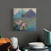 In the background, shrouded in a mysterious haze, the outlines of buildings can be seen. Their dark silhouettes, painted in deep blues and grays, contrast with the bright flowers in the foreground.