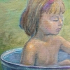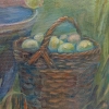 In this painting, inspired by the artist's personal memories, the serene atmosphere of a summer countryside comes to life. A child warming up in the shade of trees inside a metal basin seems to embody the very joy of life. Playful ducklings and a basket of apples add a touching innocence to the piece.