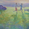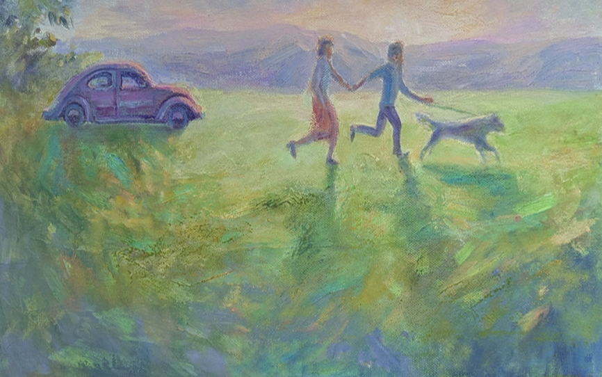 Behind the running figures, on the left side of the painting, the silhouette of a car is visible, painted in muted pinkish-brown tones. The car appears to be part of the landscape rather than a dominating element, suggesting that the journey itself and its atmosphere are more important than the means of transportation.