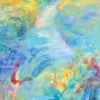 The artist uses free, expressive brushstrokes to create a sense of movement. The palette is filled with fresh blues, turquoises, sunny yellows, and soft greens that flow into each other, reminiscent of sunlight reflections on the water’s surface. Bright, contrasting accents of red and lilac add depth and dynamism to the composition.