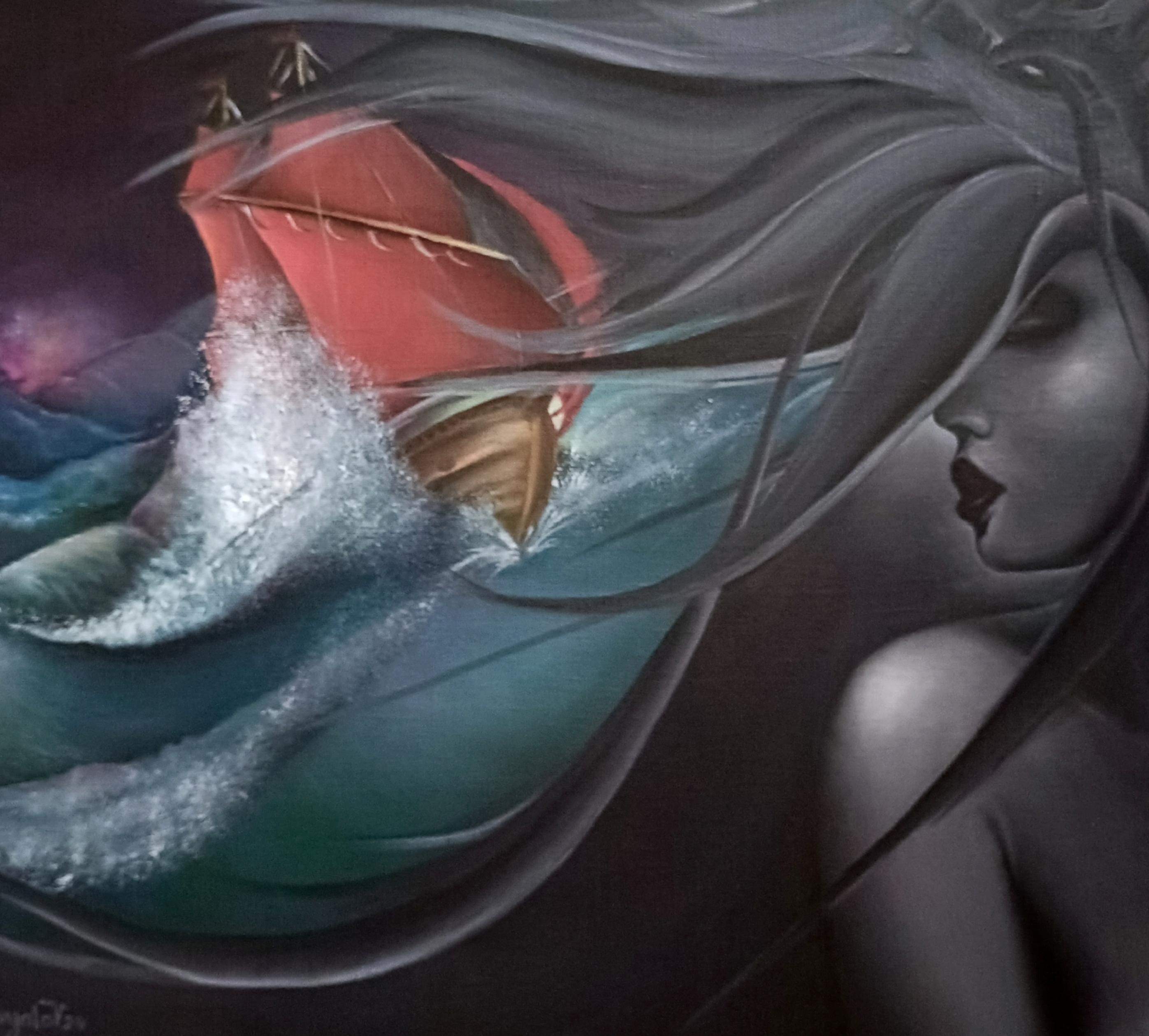 Her long, flowing hair transforms into sea waves, along which a ship with bright scarlet sails swiftly sails. The contrast of dark shades and radiant red creates a sense of magic, a fateful journey, and the power of faith in a miracle.