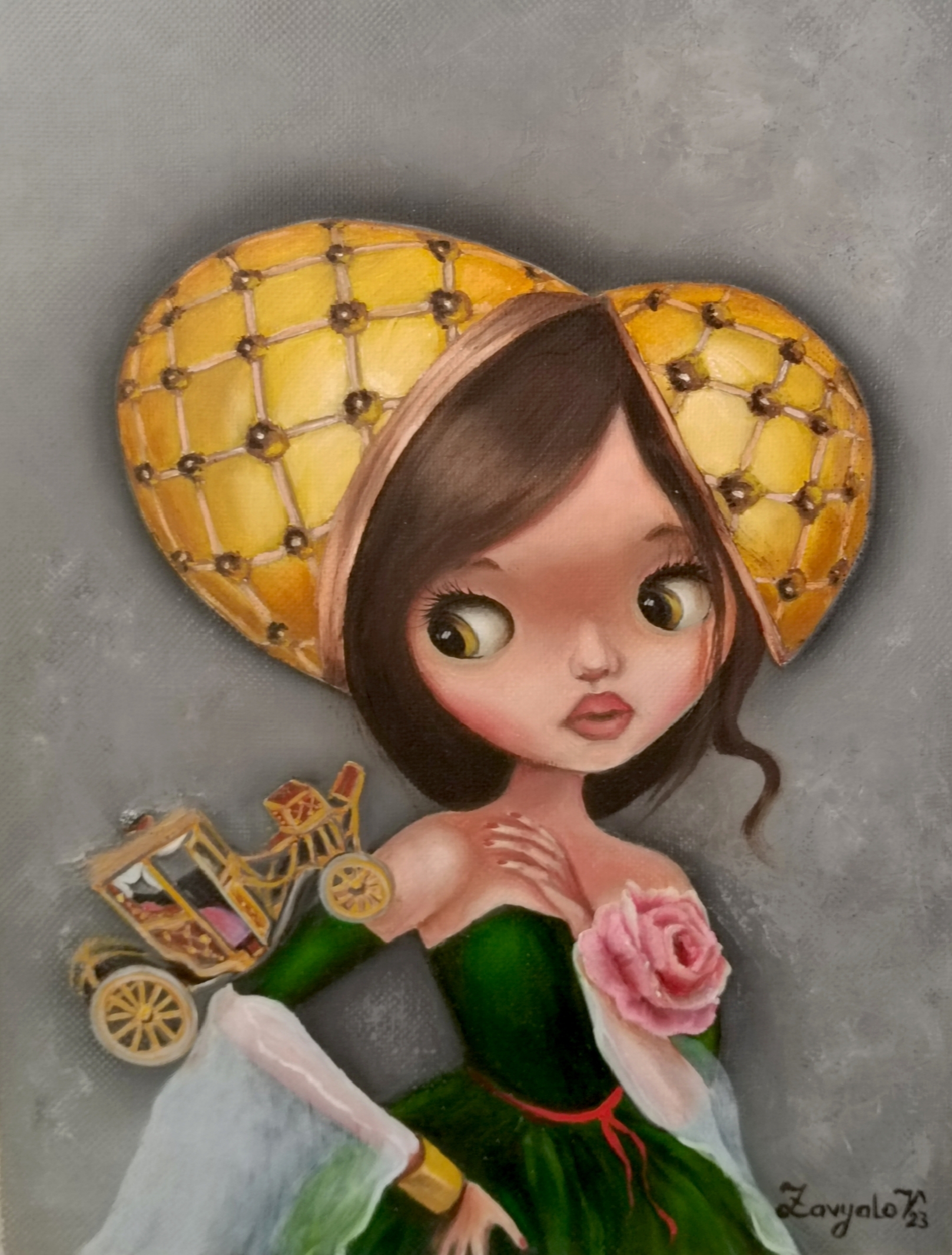 Thus, the girl in the painting becomes a bearer not only of her childhood innocence but also of echoes of former grandeur. Her dress, where a green bodice combines with delicate white ruffles, and a pink rose as a symbol of beauty and tenderness, contrasts with the golden splendor of the «cap» and carriage.