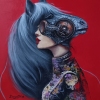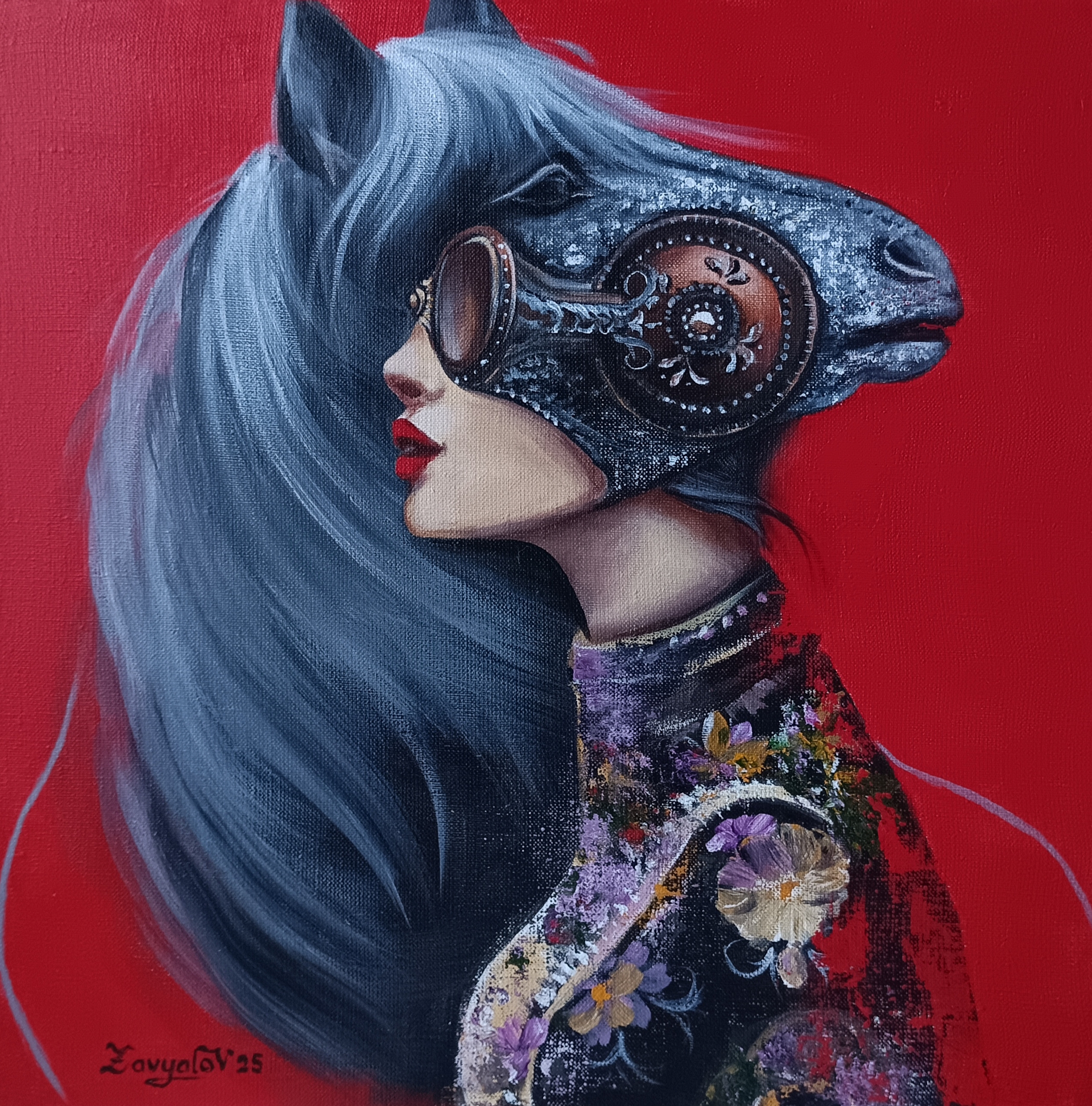 The bright, uncompromising red background of the painting serves as a powerful contrast to the cool silvery shades of the mane and the «leathery» texture of the mask. The clothing details, adorned with floral motifs, bring a touch of tenderness and traditional aesthetics, emphasizing the inner conflict between natural grace and a technological shell.