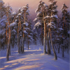 The sky, painted in shimmering golden, pink and lilac shades, seems to breathe comfort and peace. Barely noticeable traces in the snow give the scene liveliness, hinting at the presence of life in this quiet winter forest. The painting conveys the silence, purity and sense of wonder that comes to every soul on Christmas Eve.