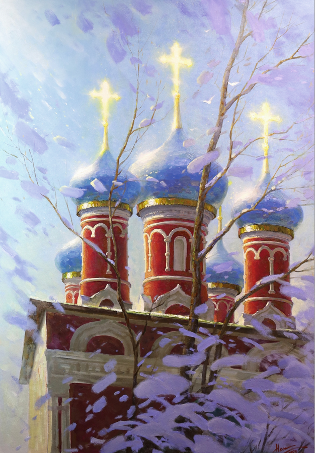 The painting "Annunciation" conveys a light and sublime atmosphere, inspired by the spirituality and beauty of Orthodox architecture. Snow-covered branches in the foreground frame the magnificent temple with its sky-blue domes, topped with shining golden crosses.