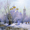 The painting "Thaw" captures the charming moment of a winter thaw, when nature begins to awaken. Against the backdrop of a soft blue sky, a majestic temple with golden domes rises, its appearance seemingly dissolving in a soft fog. The sun's rays, breaking through the light cloud cover, illuminate the snow-covered trees and the ground, on which the first thawed patches have already appeared.