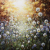The painting "Dandelions" takes us to a sunny meadow, where a multitude of fluffy dandelions seem like a living magic carpet. The sunlight penetrates the foliage with soft rays, filling the space with a golden glow. The shades of the snow-white dandelion heads are subtly conveyed: each of them seems to glow against the background of warm golden-brown tones of the grass and trees.