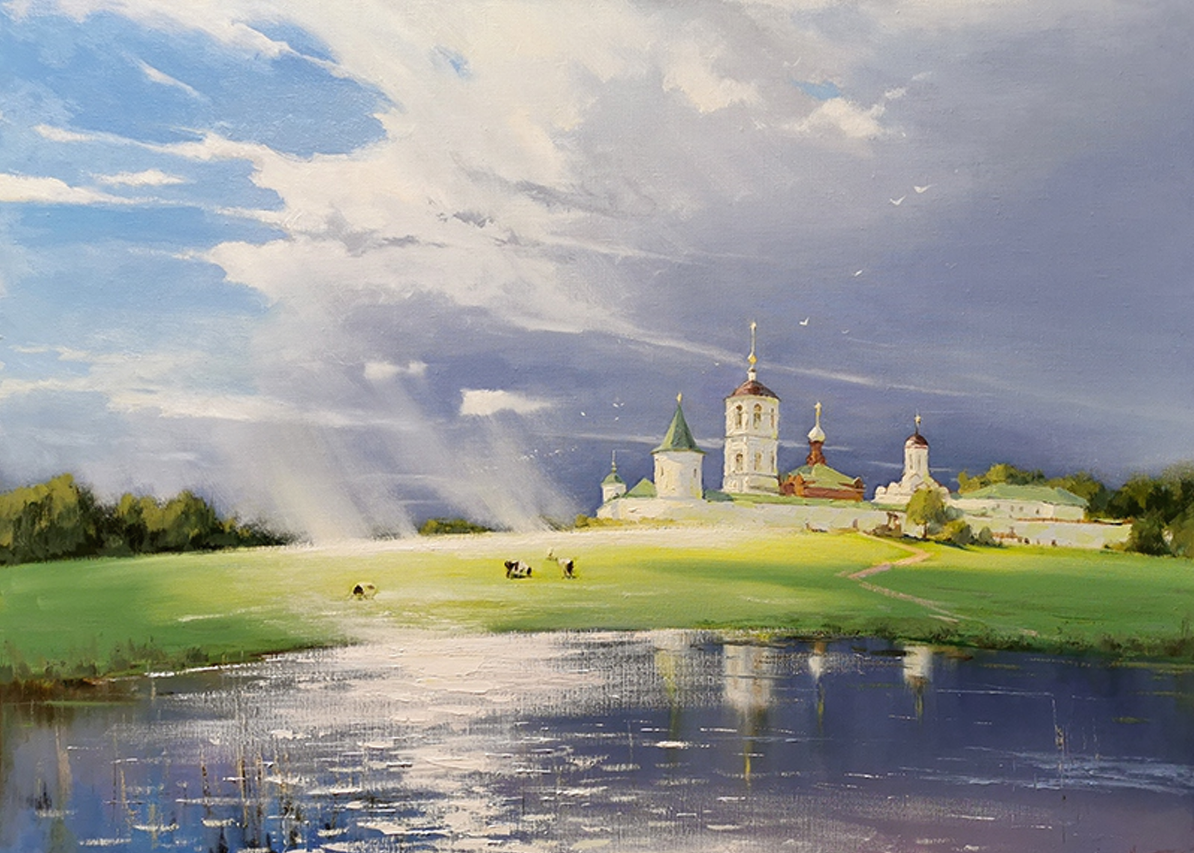 The painting "Nikolo-Peshnoshsky Monastery. After the Rain" conveys an atmosphere of silence and light after a thunderstorm. In the foreground, a small lake mirrors the sky, grass and outlines of the monastery, enhancing the feeling of freshness and purity. Green meadows after the rain play with rich shades, and light rays of the sun, breaking through the ragged clouds, illuminate the architecture of the monastery, emphasizing its calm beauty.
