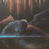 The painting "A Fallen Angel Seeing His Reflection for the First Time" is filled with drama and deep symbolism. Against a dark background, the figure of a fallen angel appears, leaning towards the surface of the water. His outstretched wings, combining reflections of cool blue and warm fiery amber hues, seem to float in the flickering light, creating an impression of fragility and lost grandeur.