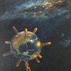 The painting "Broke off the chain" is filled with powerful symbolism related to the themes of freedom, responsibility and cosmic loneliness. In the center of the composition is the planet Earth, shown not only as a familiar world, but also as an object resembling a sea mine. Metal pins extend from it, symbolizing both protection and a threat to the surrounding space.