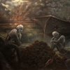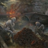 In the background, a chaotic landscape: the wreckage of a ship and the lights smoking on the horizon indicate the scene of a past catastrophe. The dim light and dark water surfacThe composition conveys an unsettling atmosphere, raising questions in the viewer about the nature of conflict, the role of technology and the inevitabe give the painting an apocalyptic mood, combining elements of nature, technology and the aftermath of war.