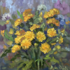 The painting "Dandelions" radiates a sincere and warm atmosphere. The canvas depicts a bouquet of cheerful yellow dandelions, which become the central accent of the composition. Their bright colors contrast with a soft background of muted blue, purple and gray shades, created with broad brushstrokes.