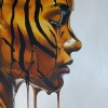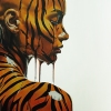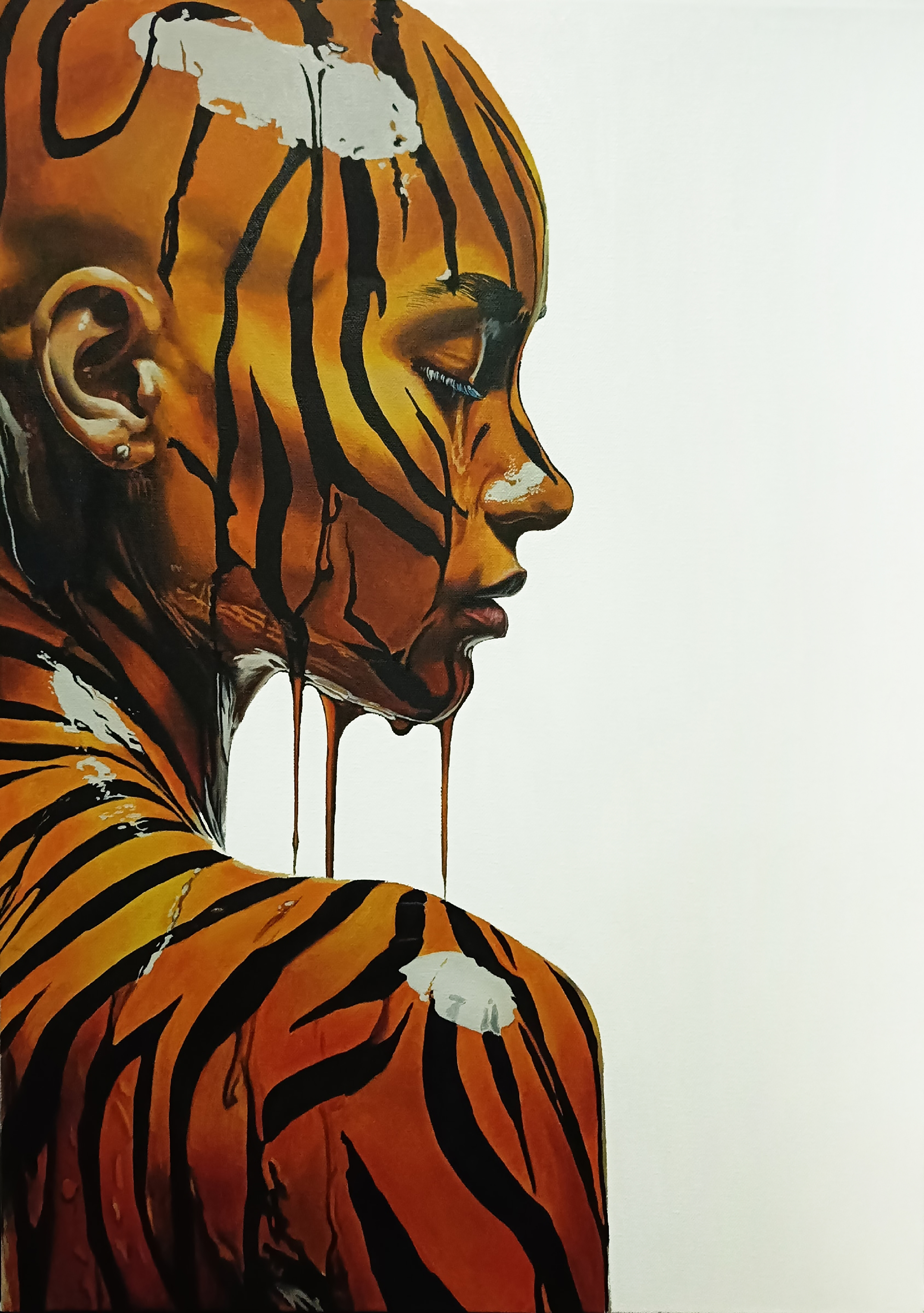 The oil painting on canvas titled «Sunrise» depicts a woman with her face and body covered in stripes resembling tiger fur. The stripes are rendered in orange and black tones on a white background. The painting is complemented by drops of paint dripping from the woman's chin.